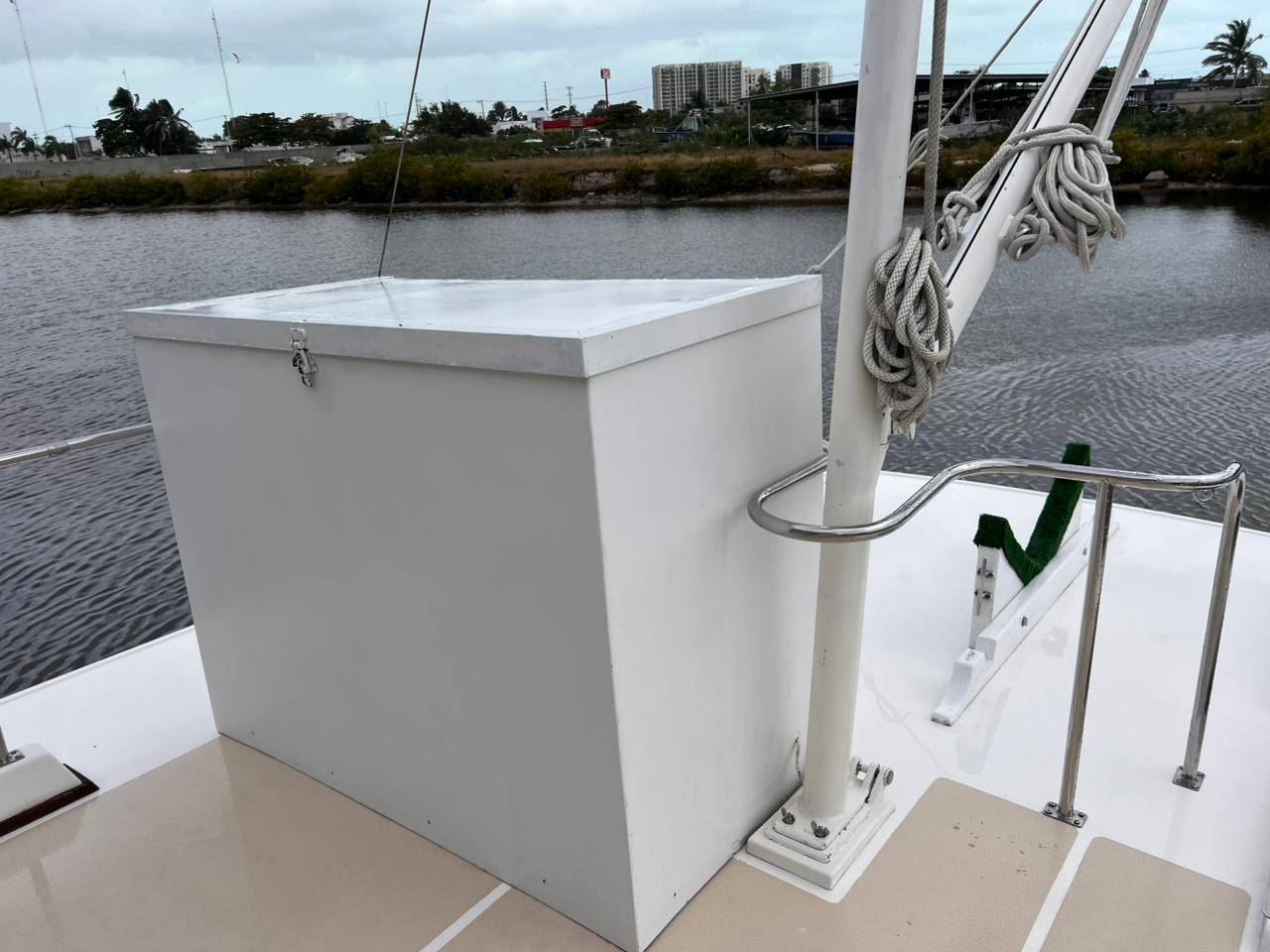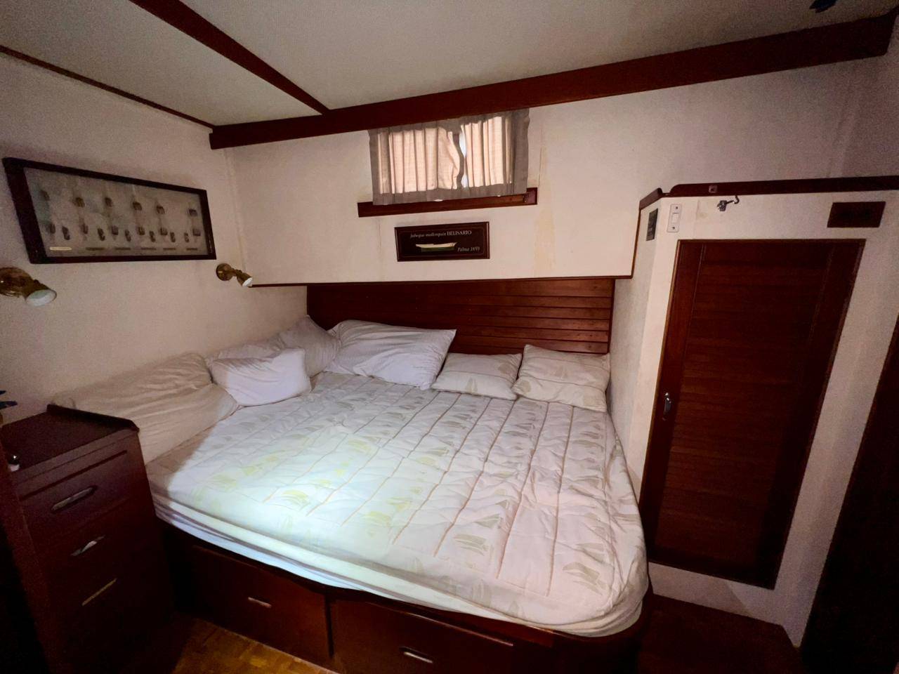 Distribución de 2 cabinas / 2 baños: camarote principal en popa con cama queen en el centro y ducha privada, cabina de invitados en proa con cama en V y baño adyacente & ducha independiente