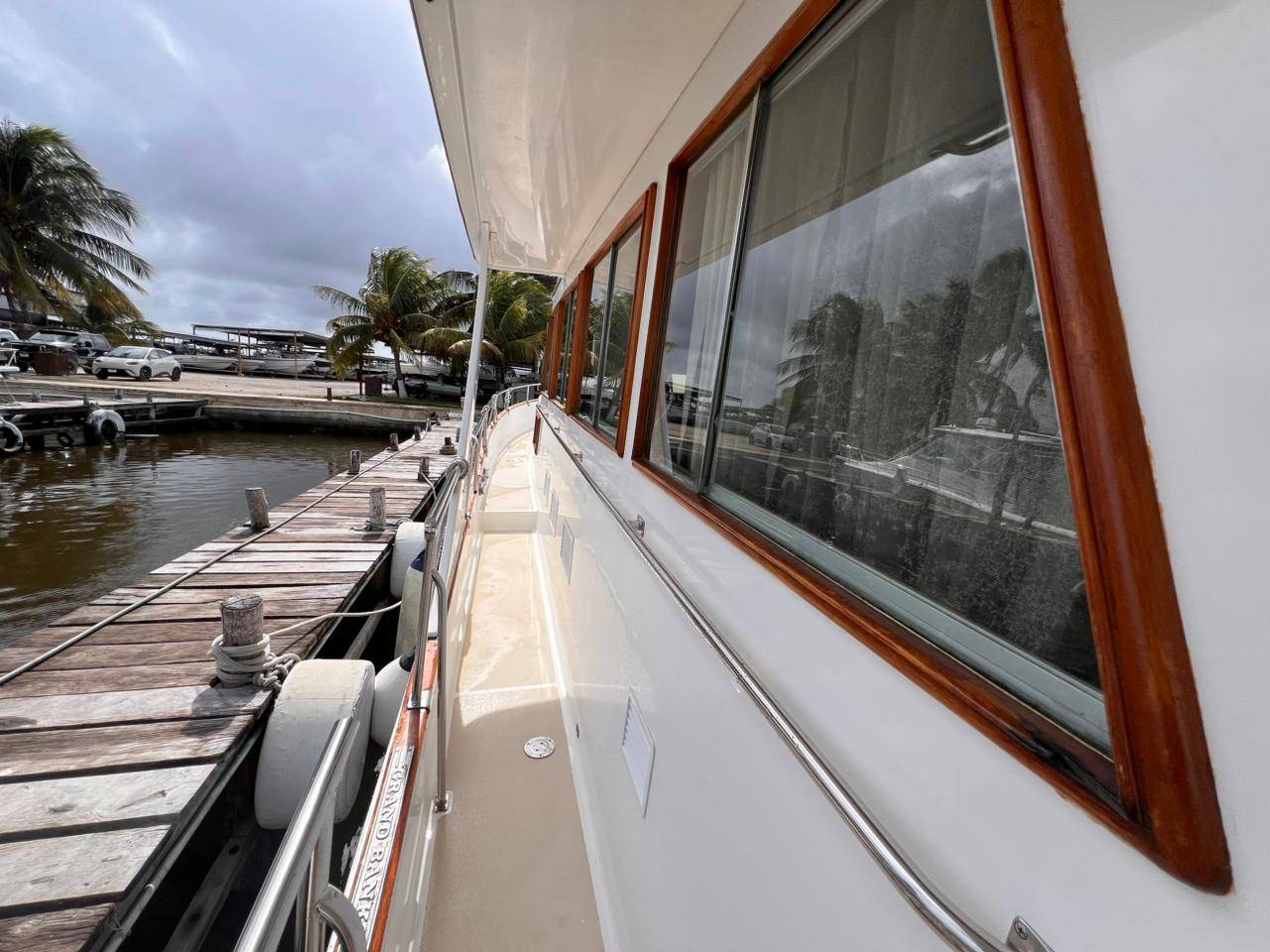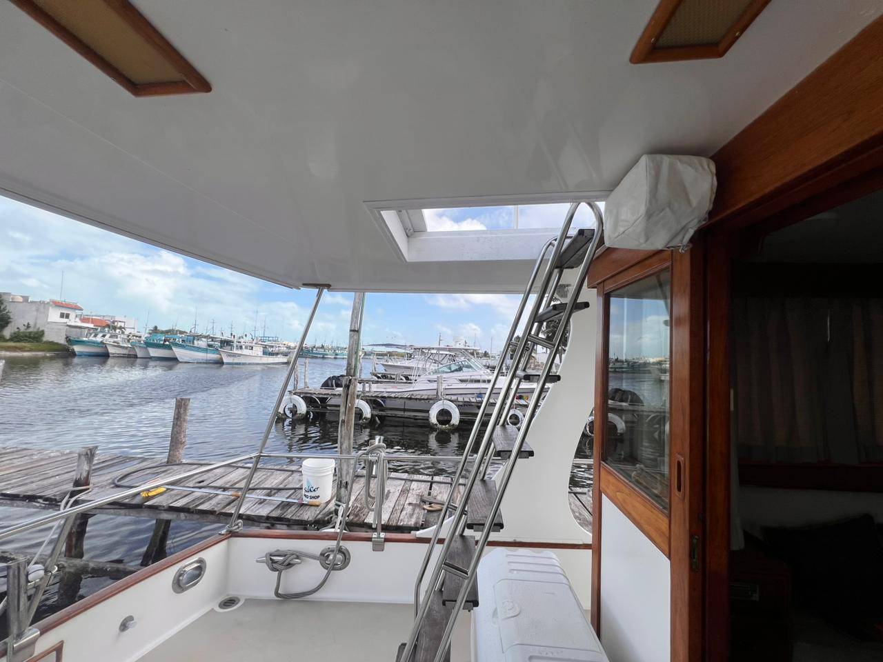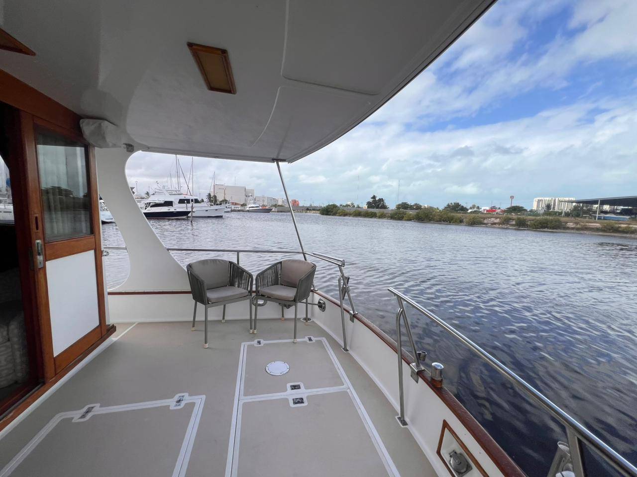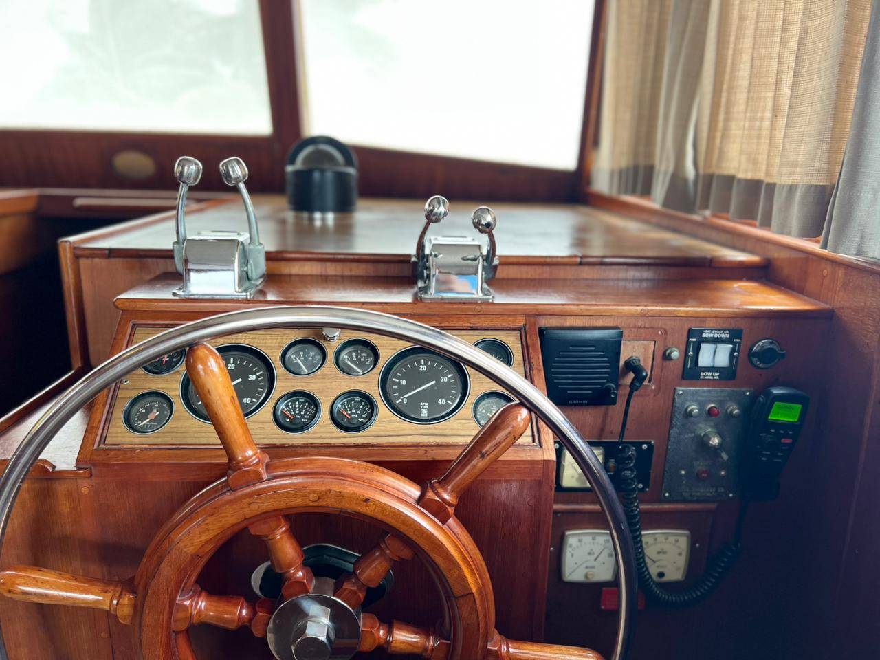 Su diseño de trawler clásico combina líneas marineras con una distribución interior pensada para la vida a bordo: amplios espacios, maderas nobles, gran luminosidad natural y un ambiente cálido y acogedor. Dispone de generosas zonas exteriores, con flybridge espacioso y cubiertas laterales seguras, ideales para maniobras y disfrute al aire libre.