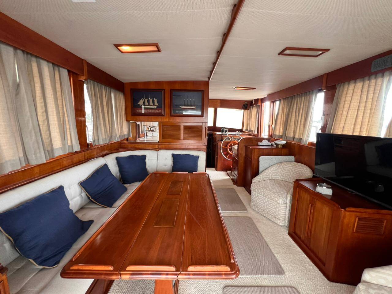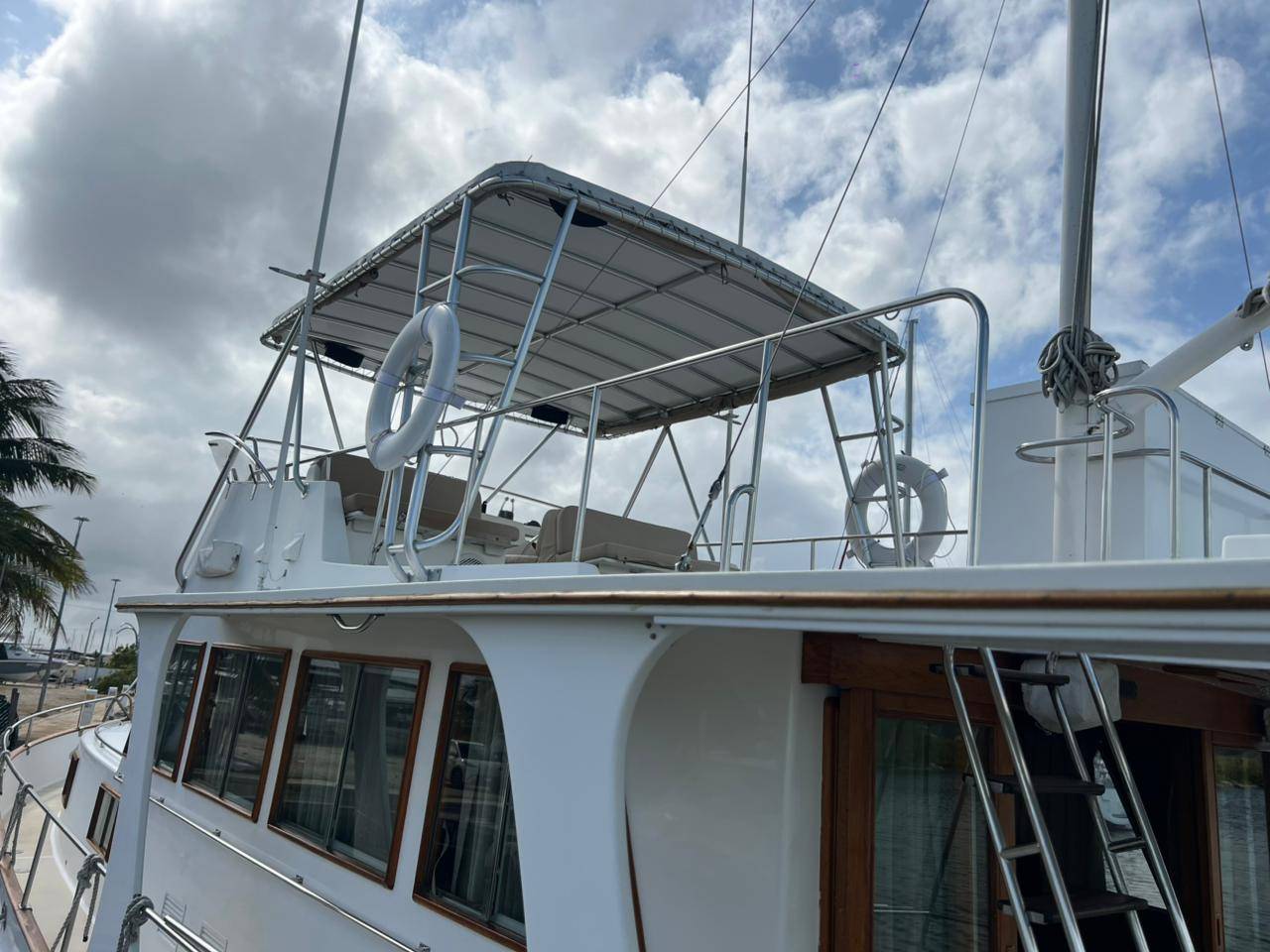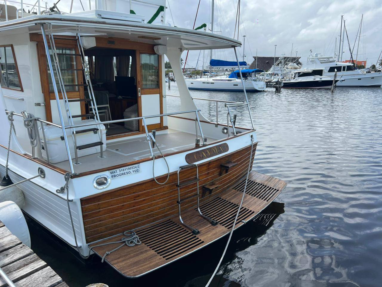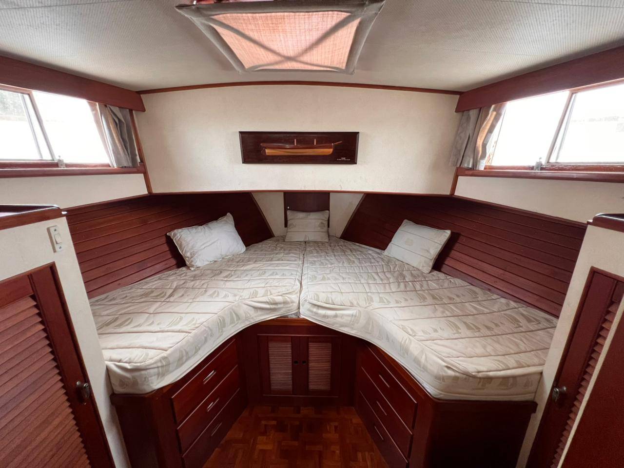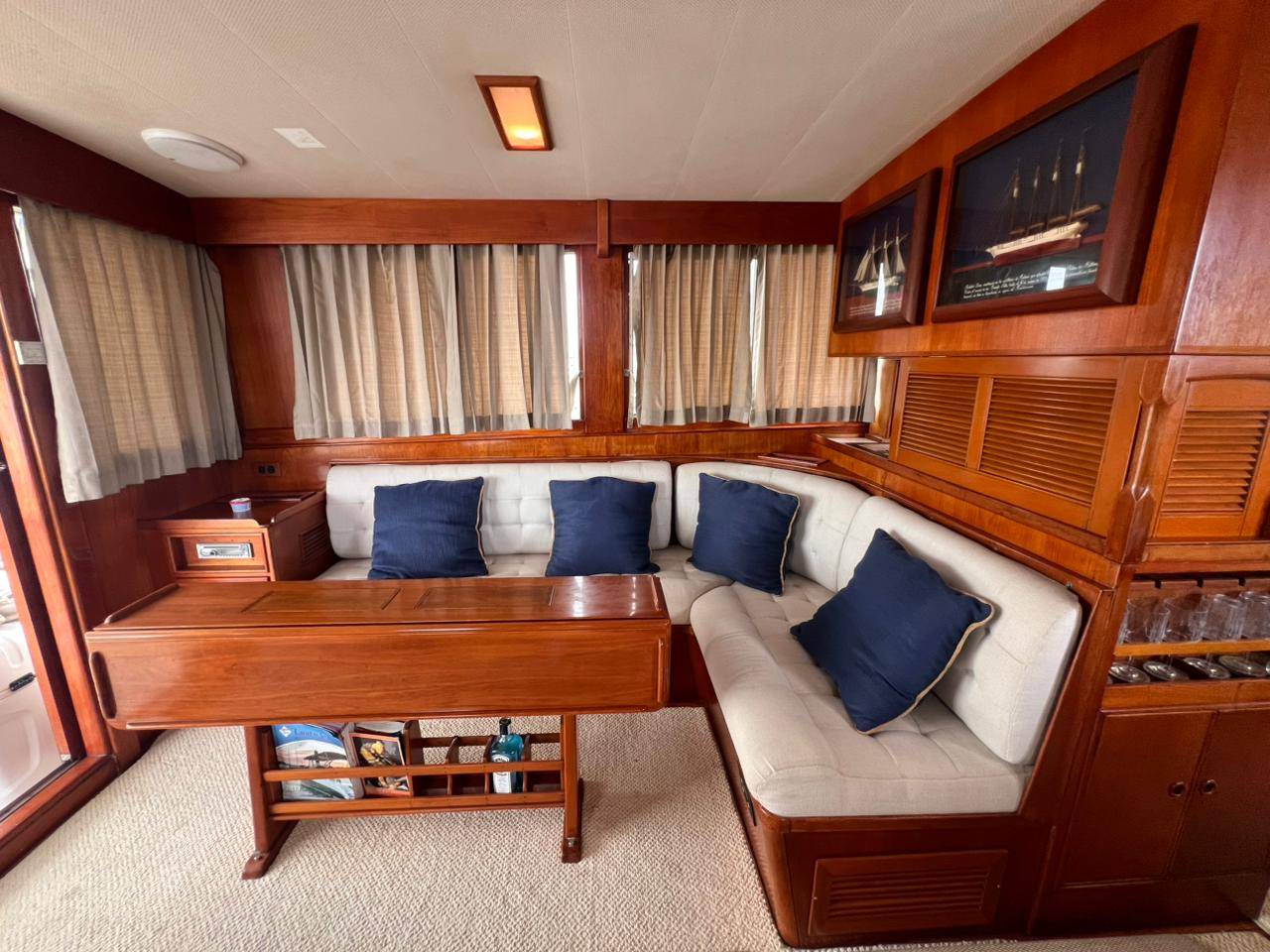 Su diseño de trawler clásico combina líneas marineras con una distribución interior pensada para la vida a bordo: amplios espacios, maderas nobles, gran luminosidad natural y un ambiente cálido y acogedor. Dispone de generosas zonas exteriores, con flybridge espacioso y cubiertas laterales seguras, ideales para maniobras y disfrute al aire libre.