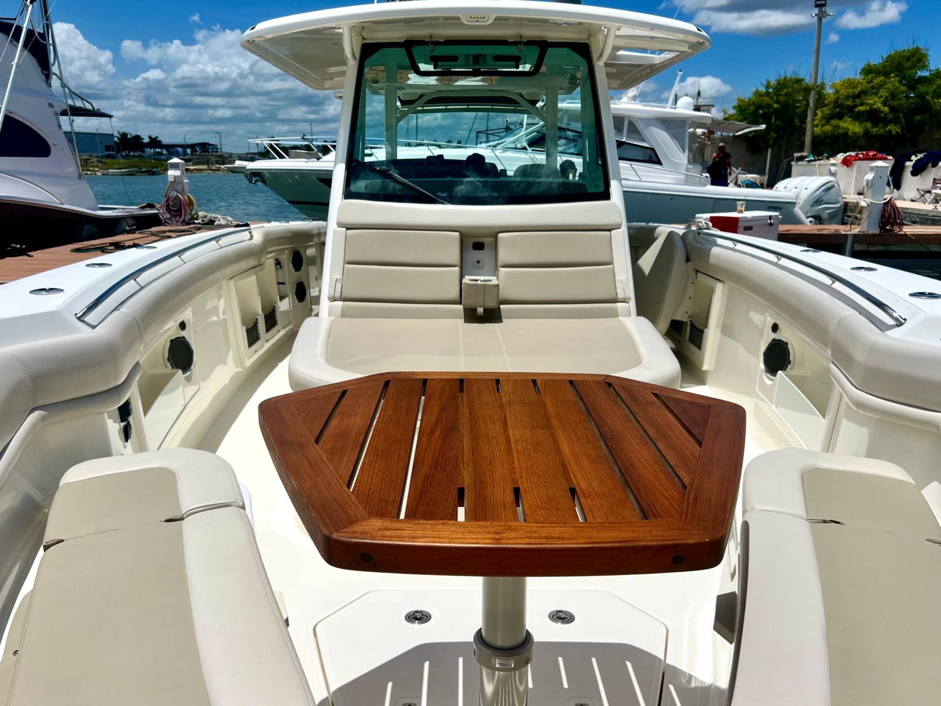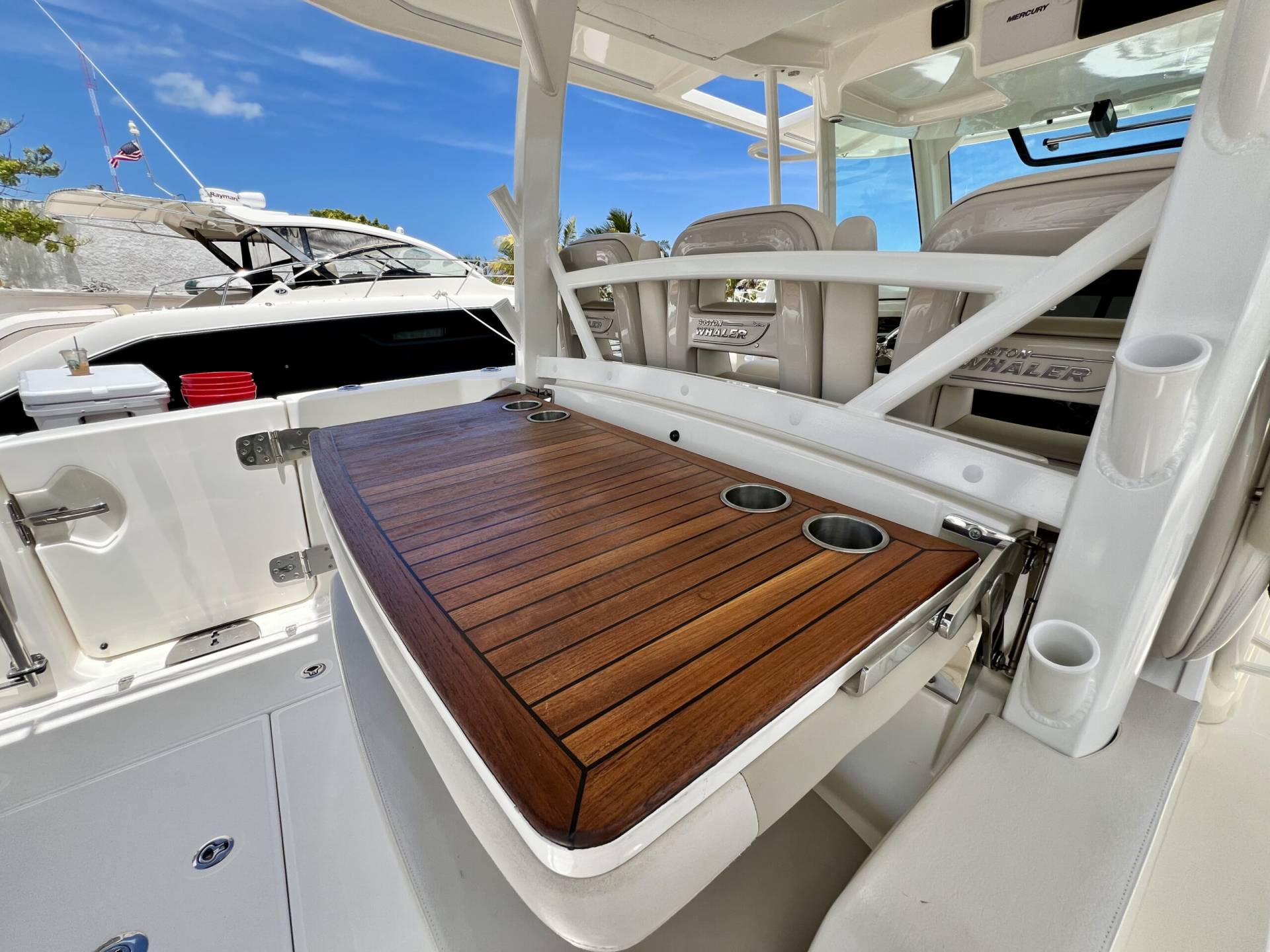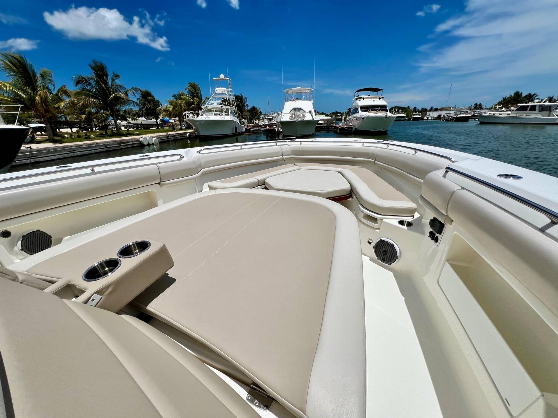 Drink Holders: stainless steel (2) in bow, (2) in hawse pipes, (2) at helm, (2) at consnole lounge, (2) in cockpit couch armrests and (4) in couch flip table.