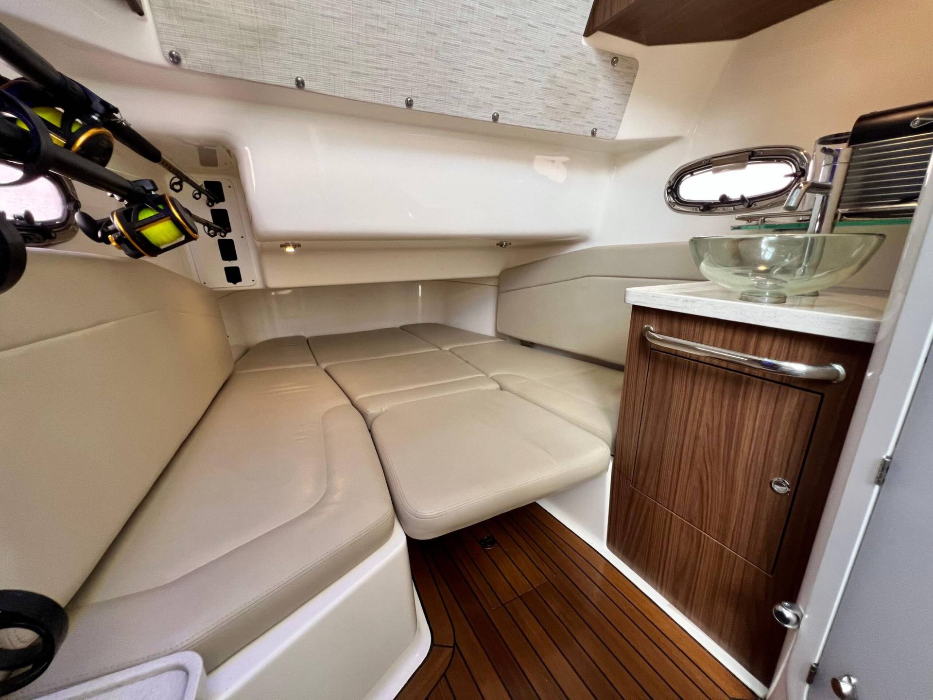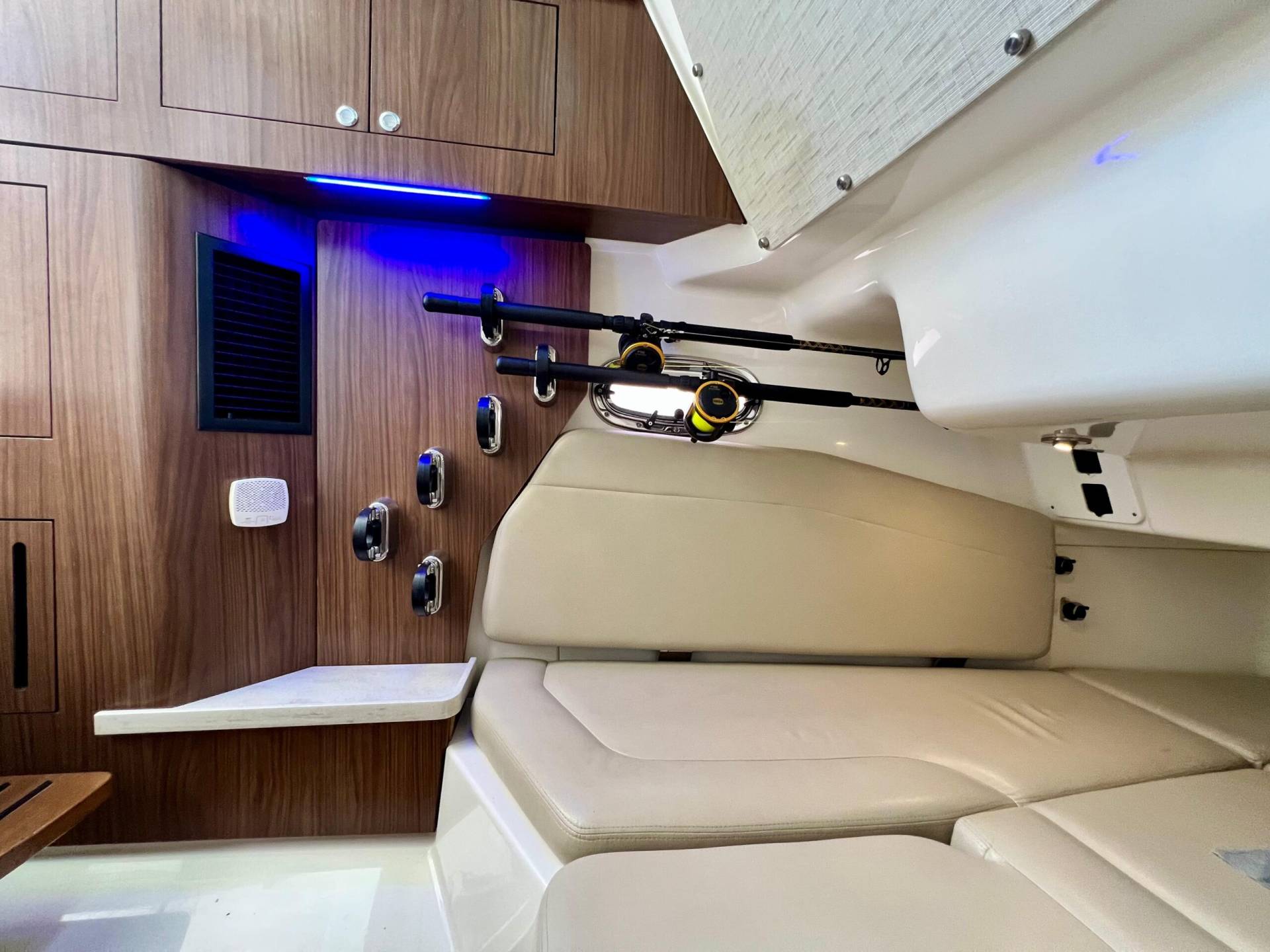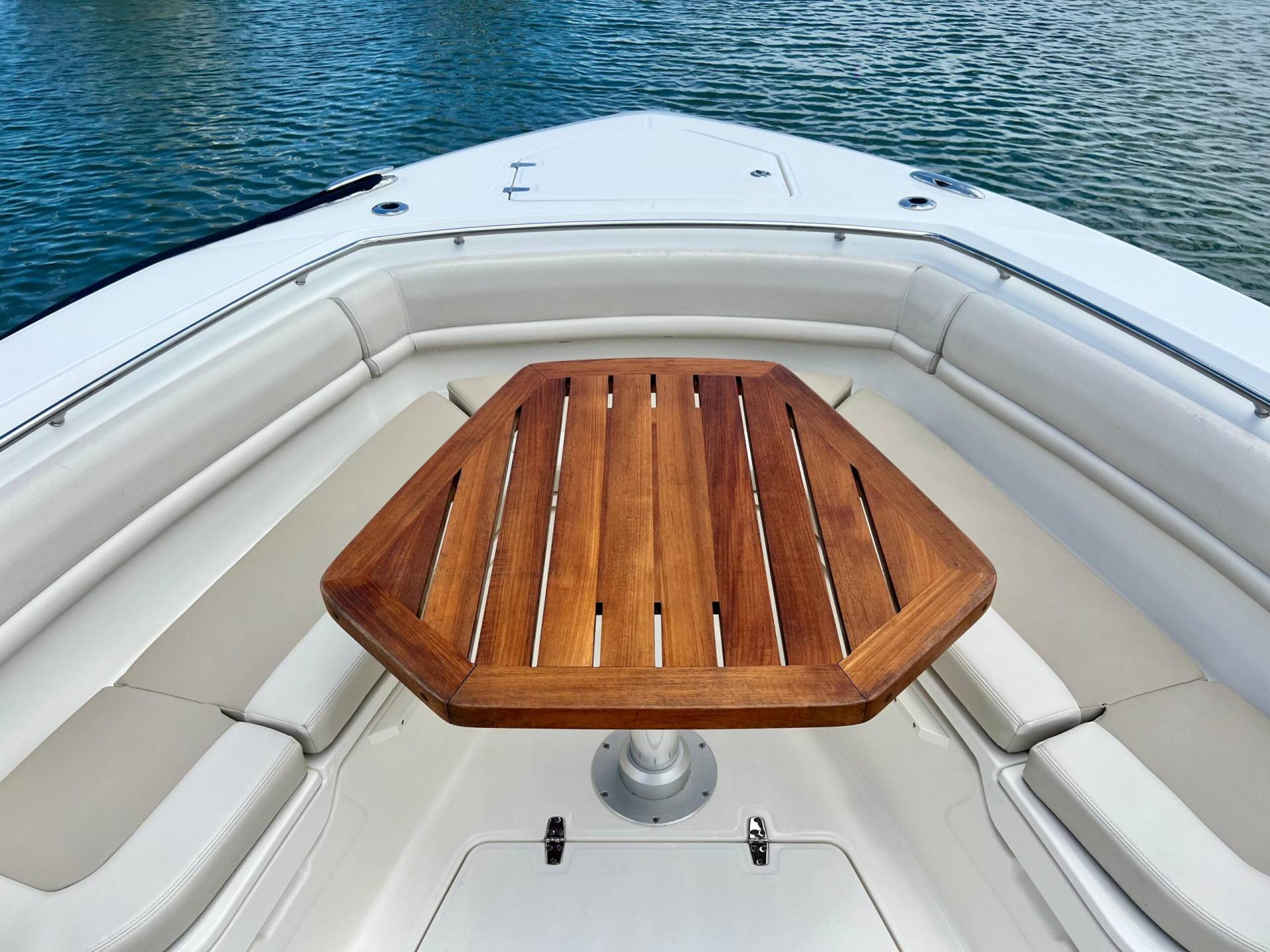 Drink Holders: stainless steel (2) in bow, (2) in hawse pipes, (2) at helm, (2) at consnole lounge, (2) in cockpit couch armrests and (4) in couch flip table.