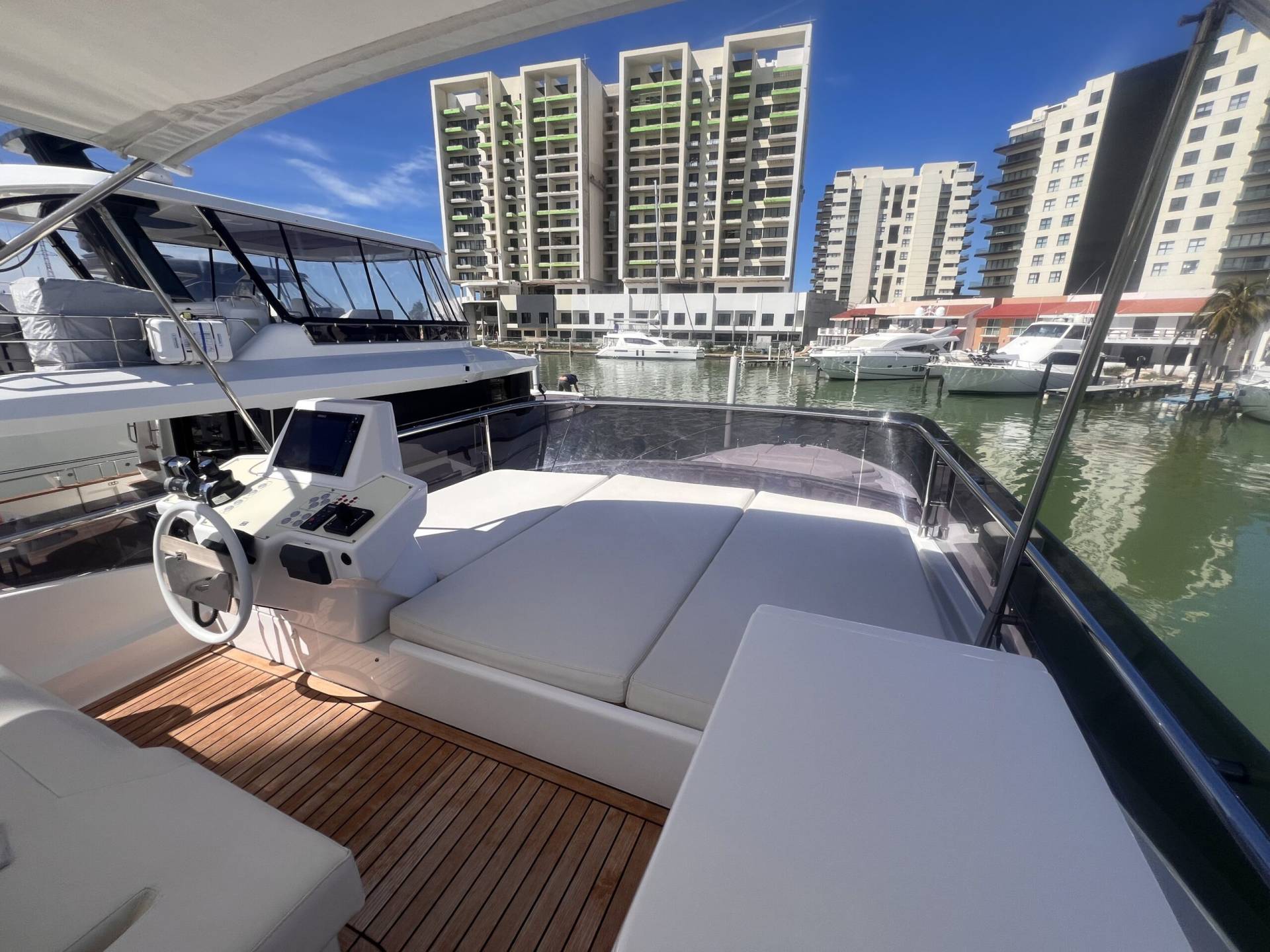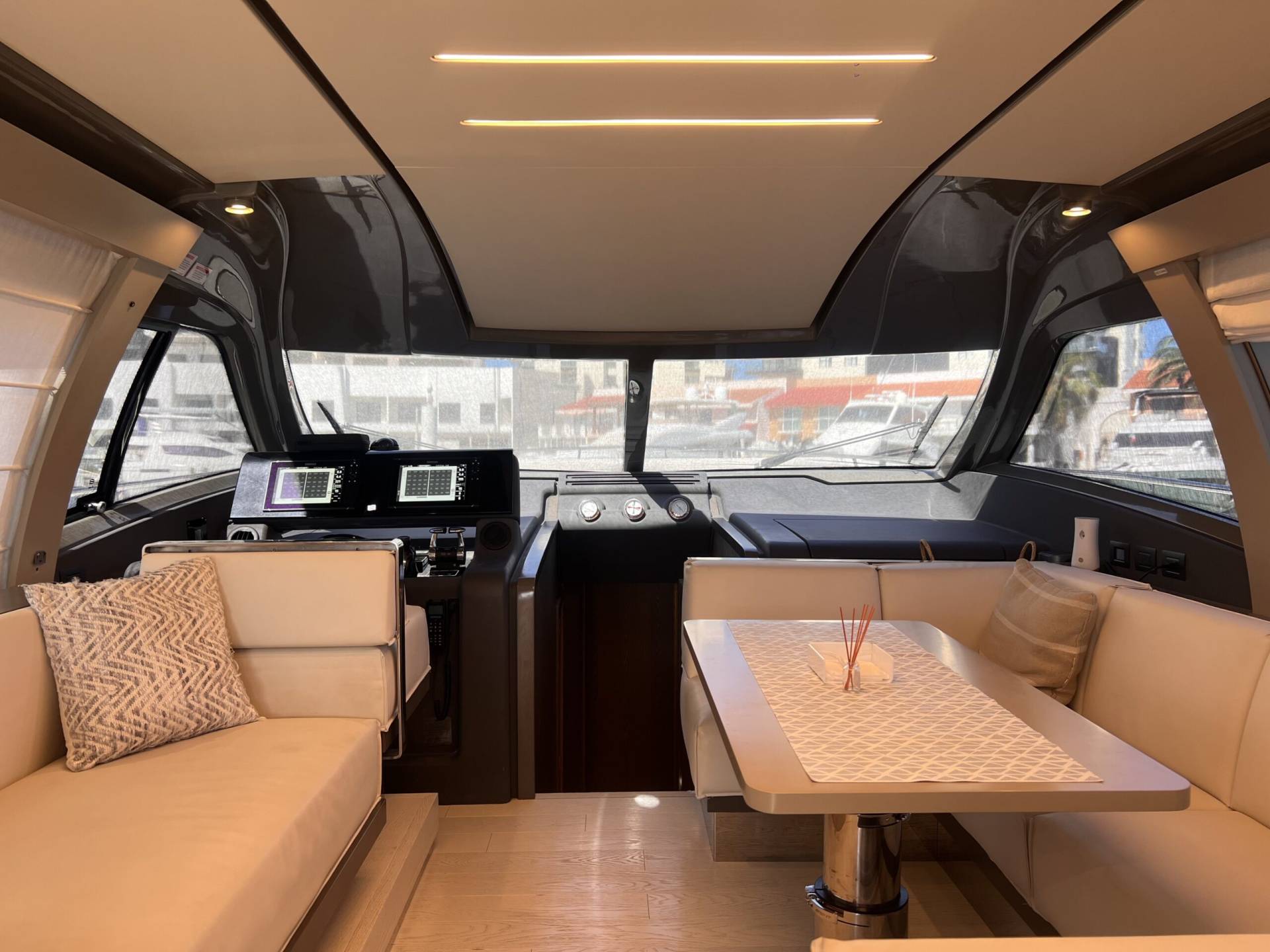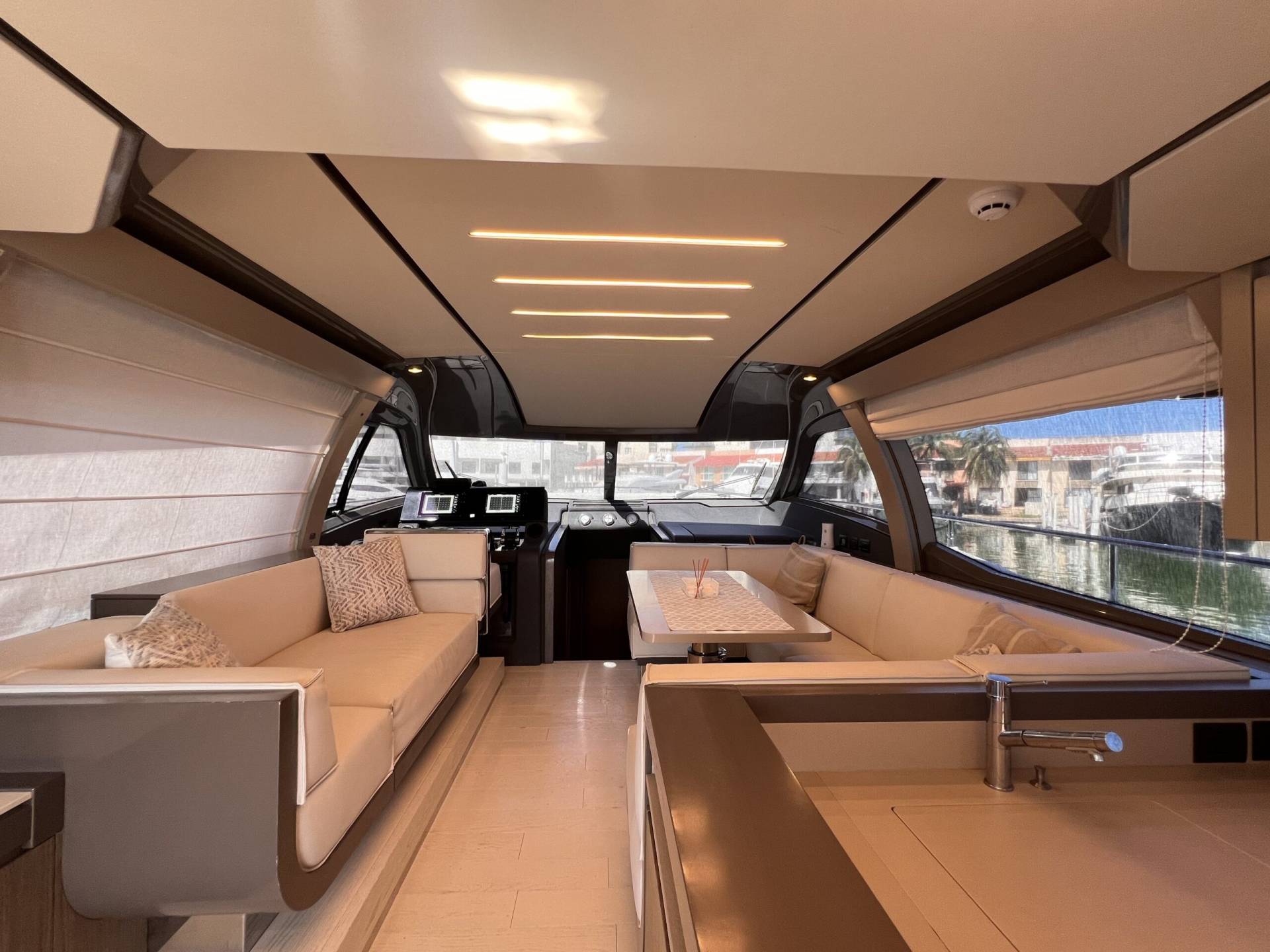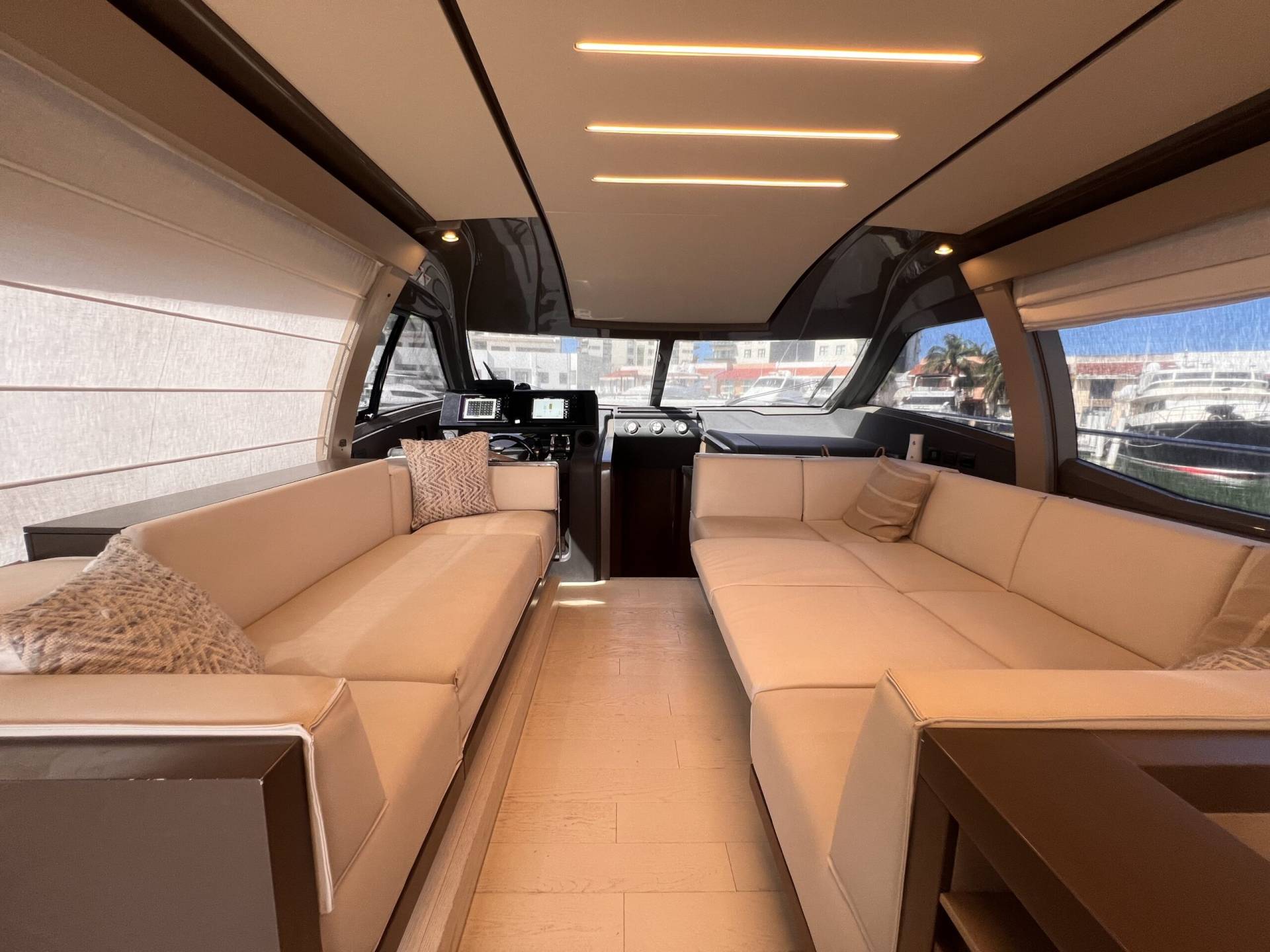 Ubicado en el main deck, el salón del Ferretti 550 Fly destaca por su sensación de espacio y luz natural.