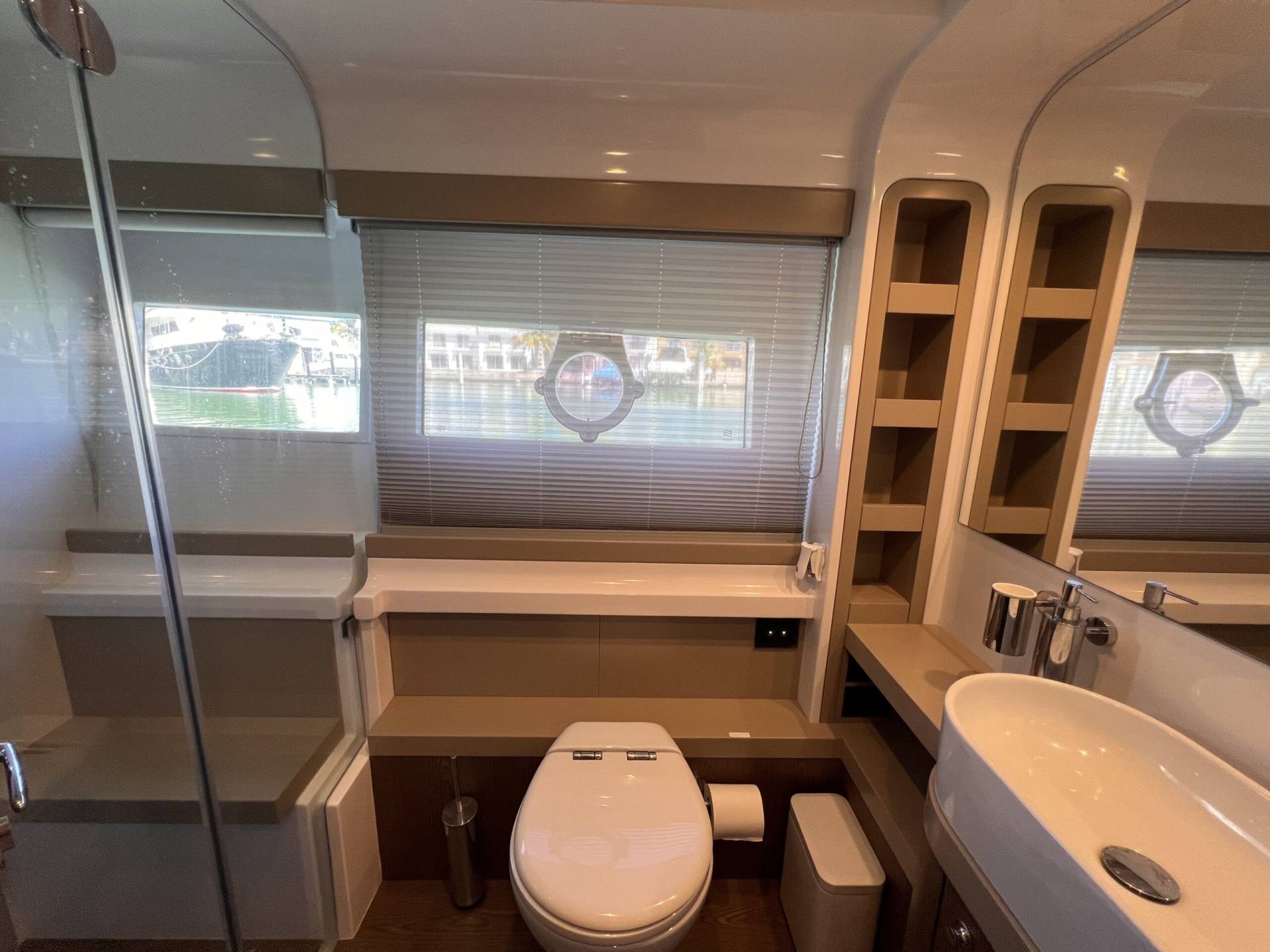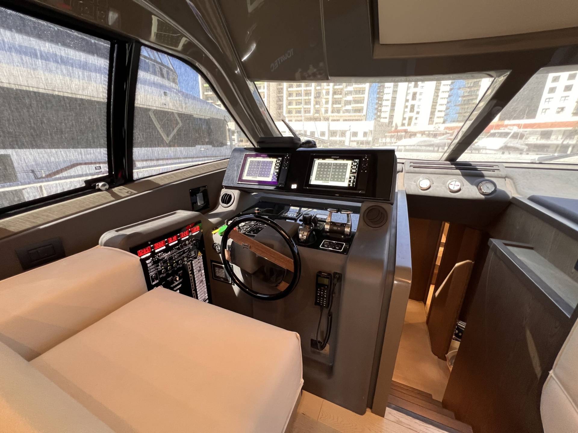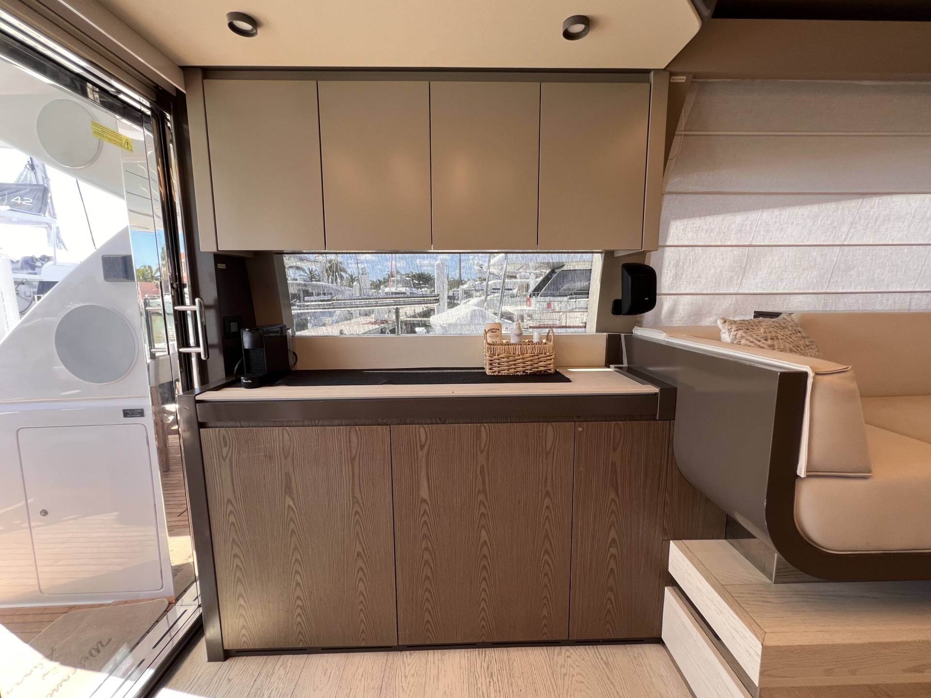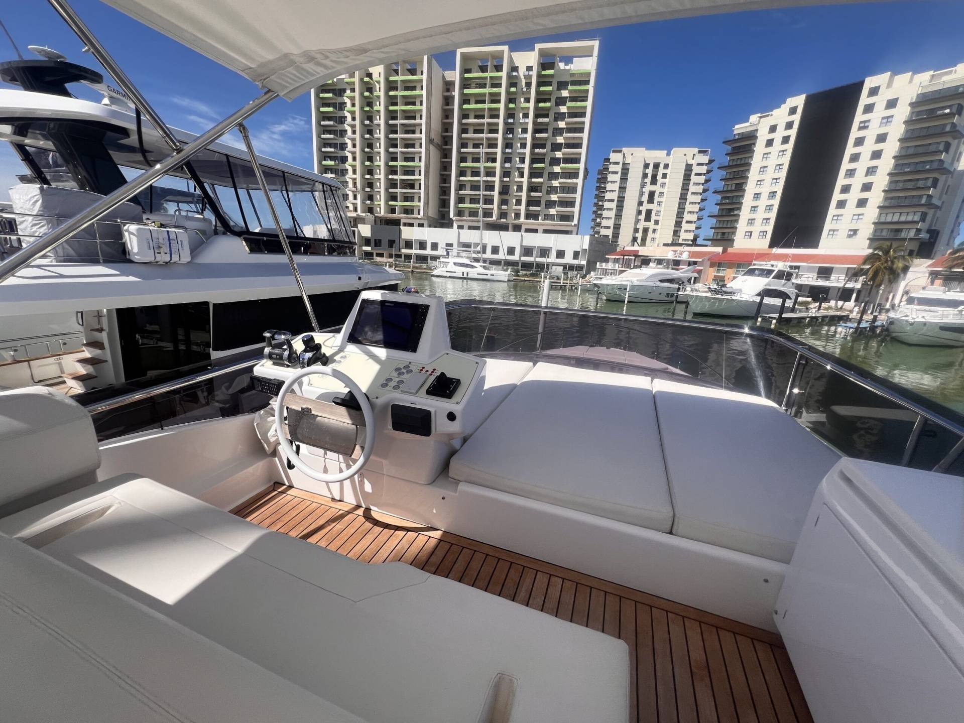 Ubicado en el main deck, el salón del Ferretti 550 Fly destaca por su sensación de espacio y luz natural.